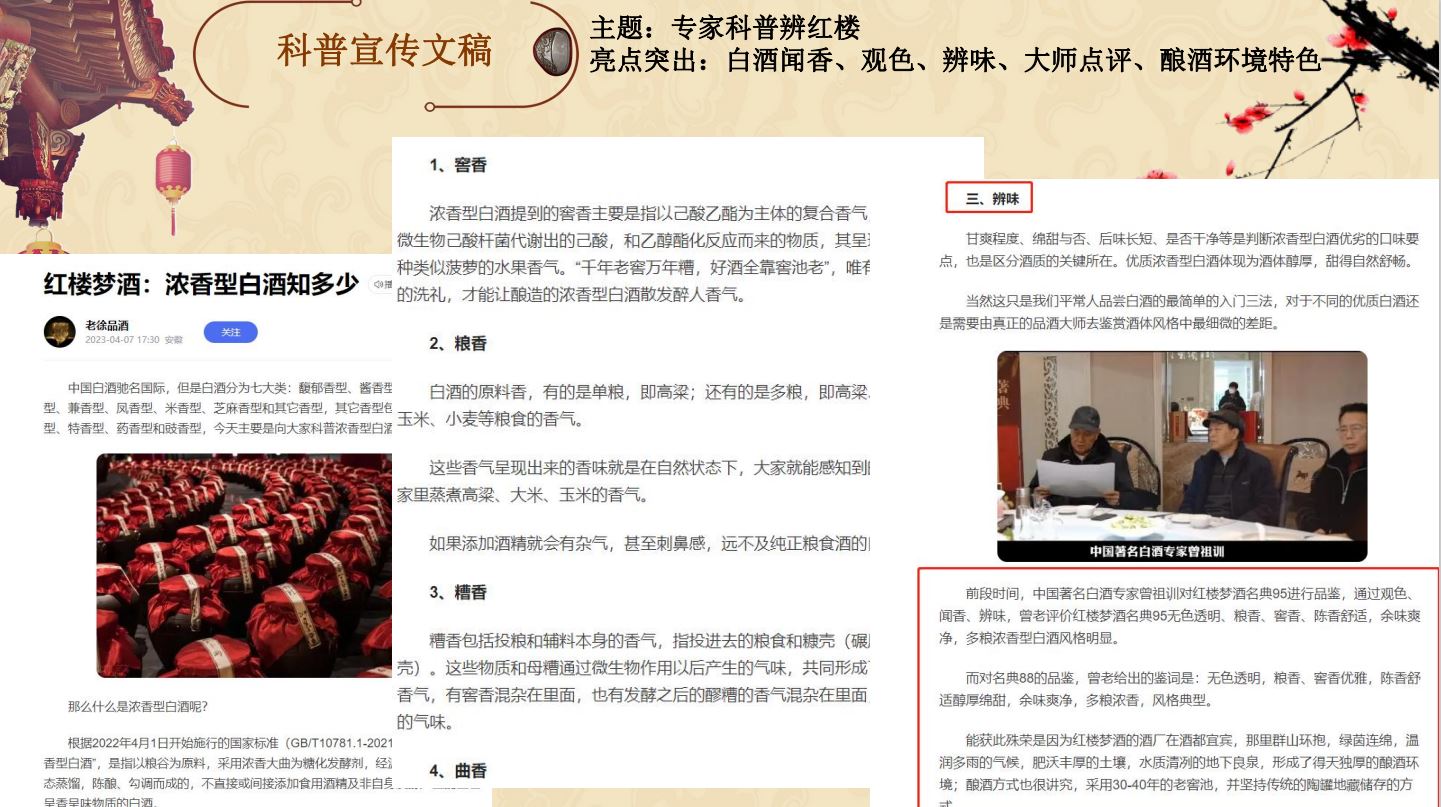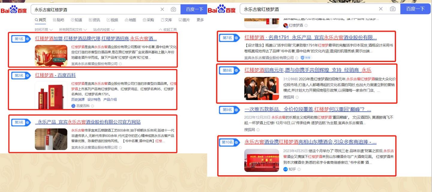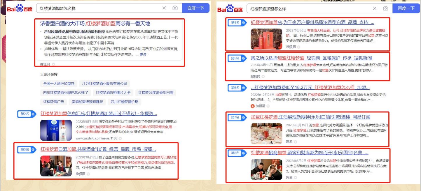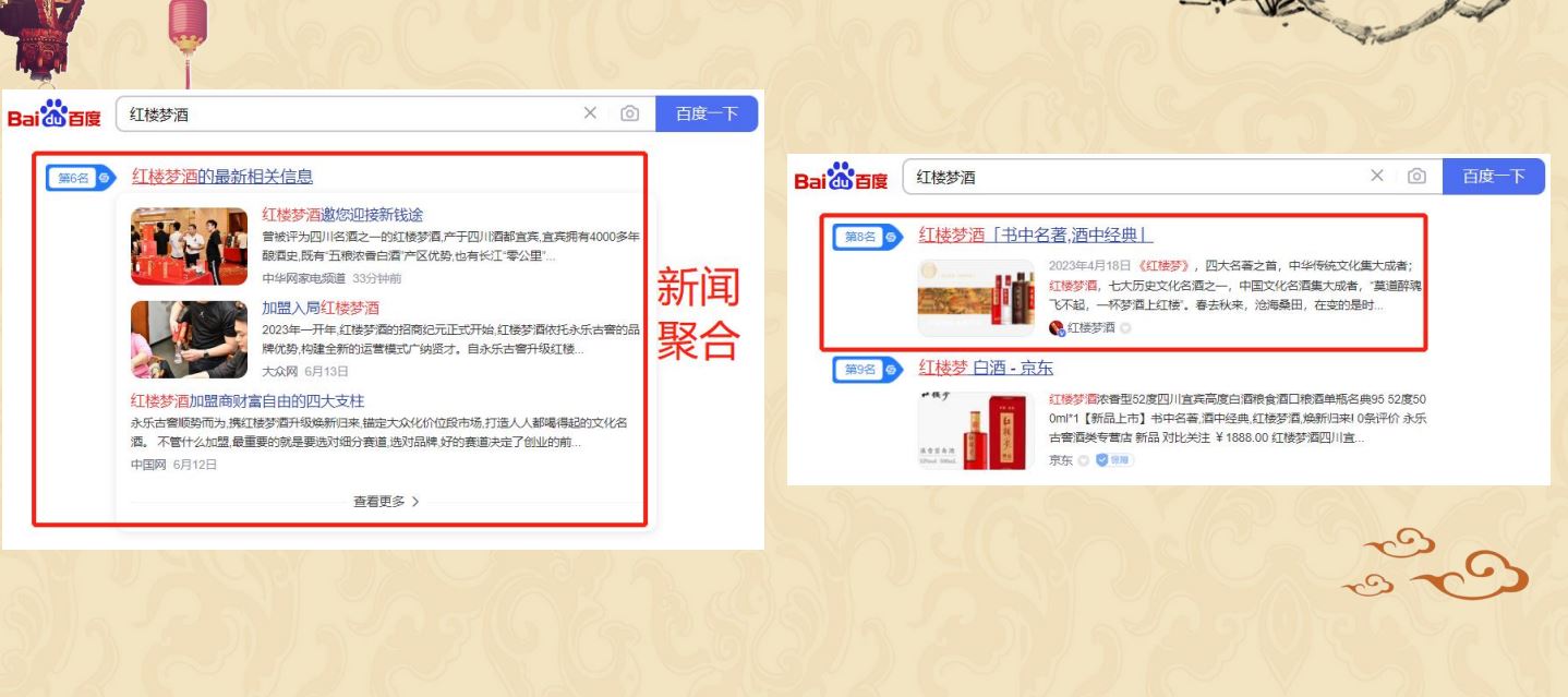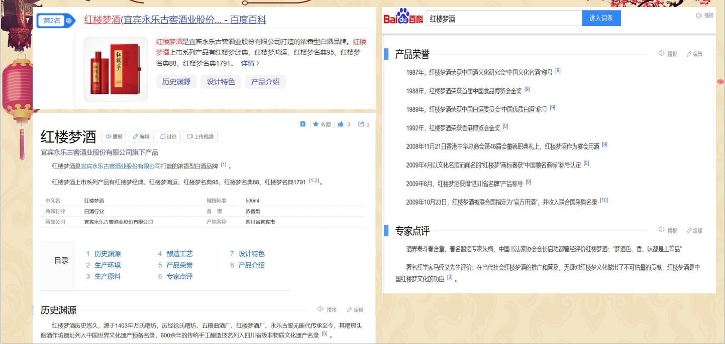 通過百科的方式增加用戶對紅樓夢酒品牌的信任程度,同時提升紅樓夢酒品牌的權威度;通過知乎問答、權威新聞、視頻展現對”紅樓夢酒“品牌詞進行搜索首頁搶位曝光。有效提升品牌的口碑和品牌形象。