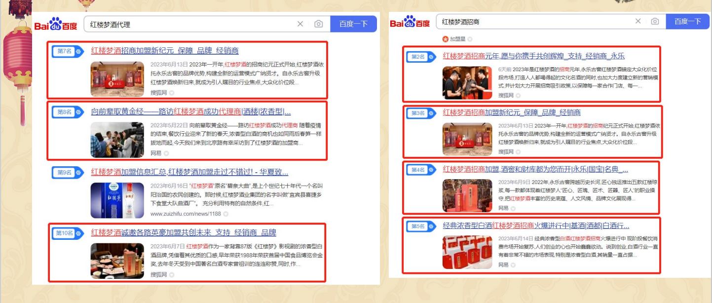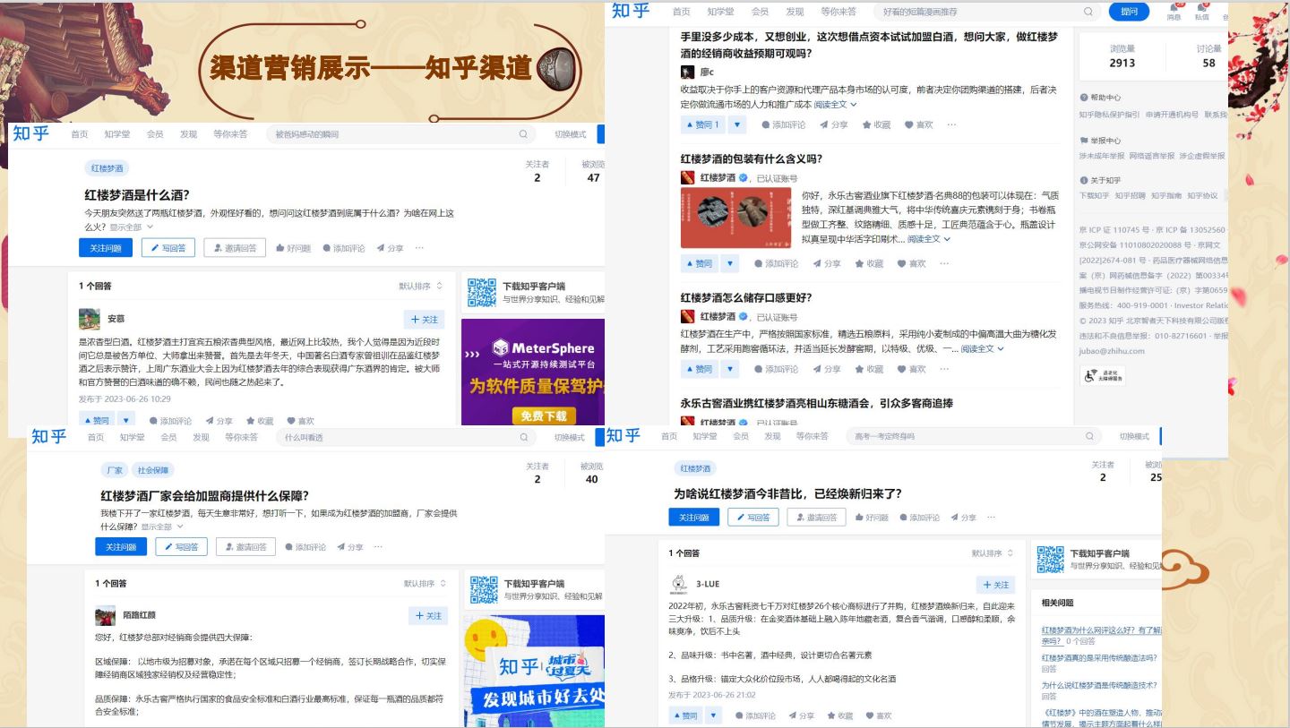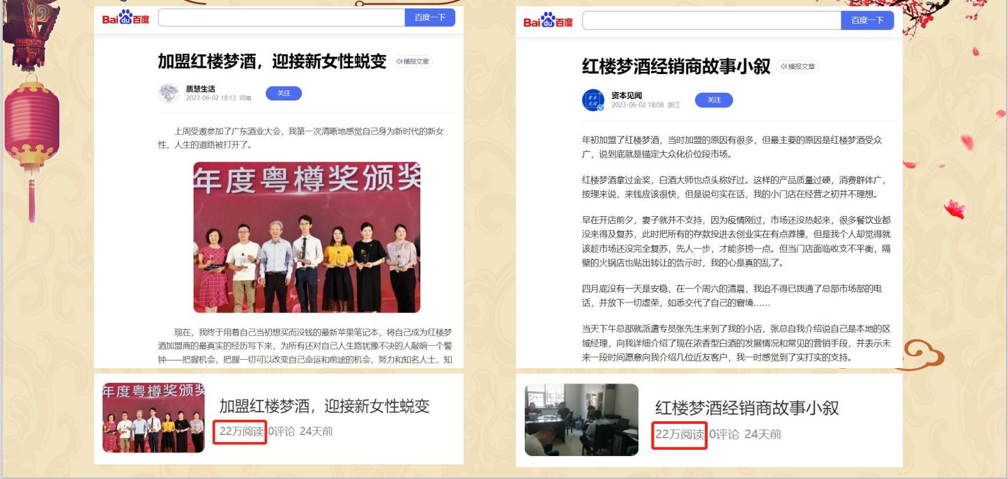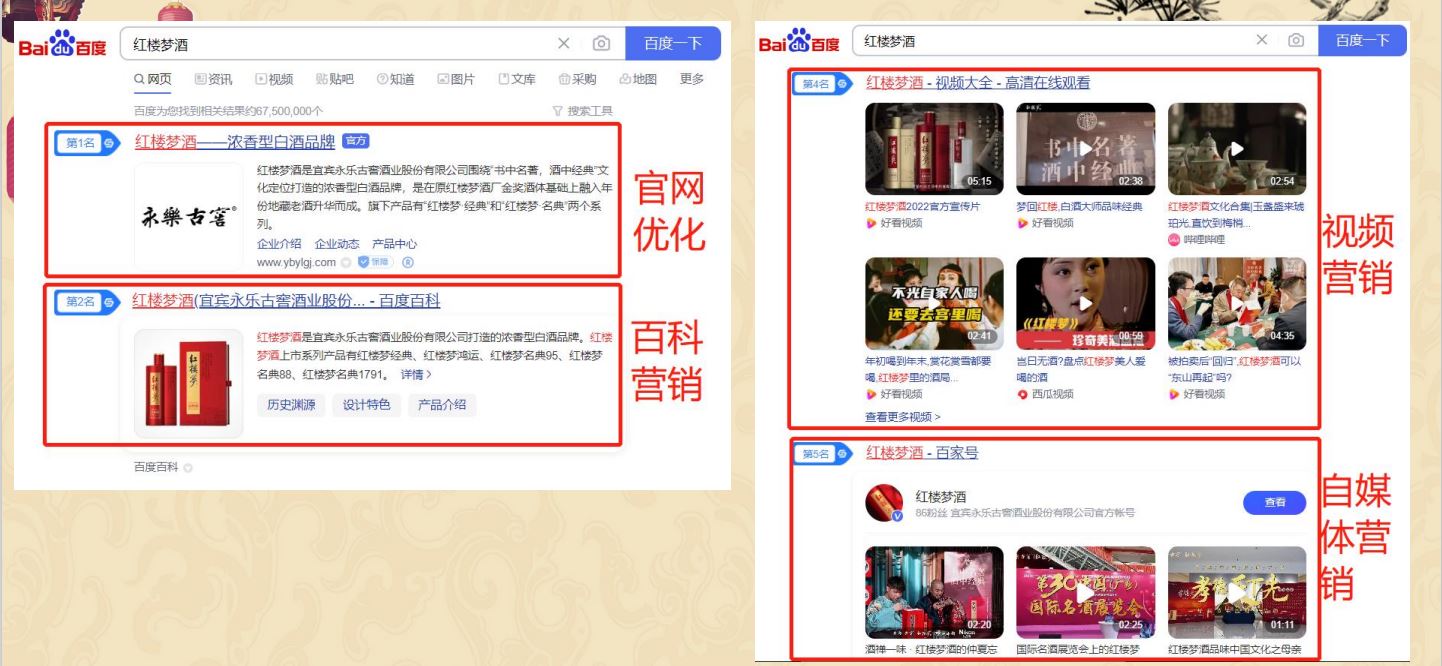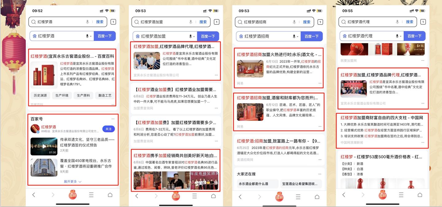 通過百科的方式增加用戶對紅樓夢酒品牌的信任程度,同時提升紅樓夢酒品牌的權威度;通過知乎問答、權威新聞、視頻展現對”紅樓夢酒“品牌詞進行搜索首頁搶位曝光。有效提升品牌的口碑和品牌形象。
